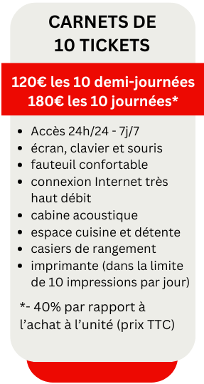 Le coworking est accessible aux coworkers inscrits tous les jour, 24h/24. Avant une première utilisation merci de nous contacter par téléphone au 04 38 90 29 53, 06 80 33 52 89 ou 06 80 02 02 17