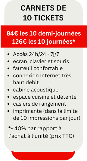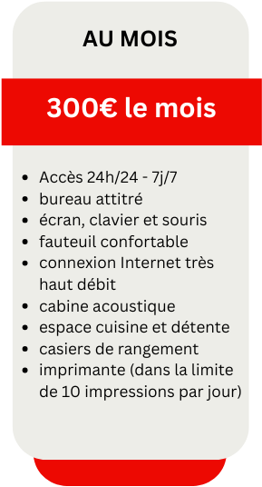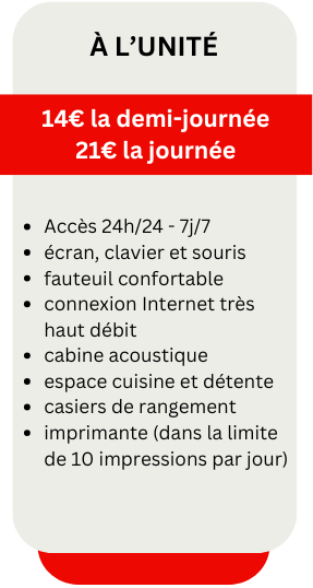 - Possibilité de de disposer d’un bureau isolé (pour visio conférence, réunions…)